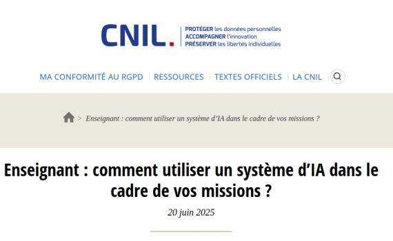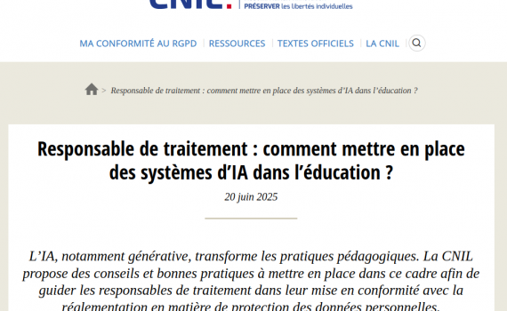 L’I.A, en particulier l’IA générative comme ChatGPT, Le Chat ou Midjourney, pourrait transformer les pratiques pédagogiques. La CNIL propose des conseils et des bonnes pratiques pour accompagner les enseignants dans l’usage de ces outils. https://www.cnil.fr/fr/enseignant-usage-systeme-ia