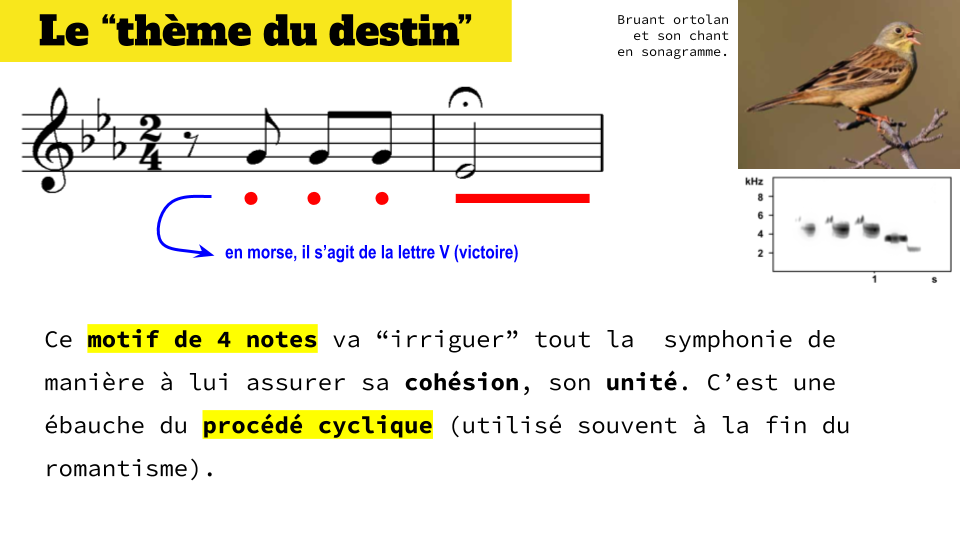 On doit rappeler ici la fameuse anecdote selon laquelle, à une question posée par Schindler au sujet de la signification des 4 notes d’ouverture, Beethoven aurait répondu : « ainsi le Destin frappe à la porte ».