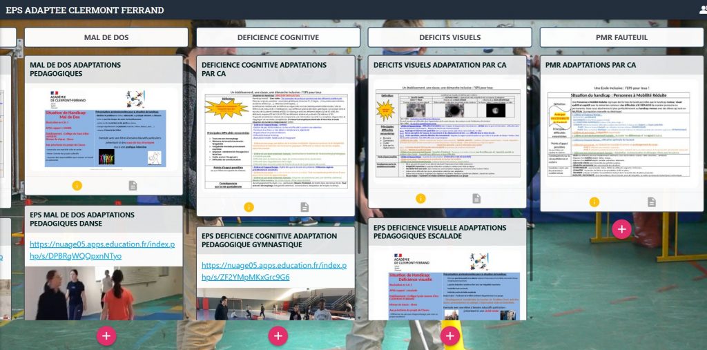 Ce Padlet rappelle les adaptations recommandées par les professionnels de santé et proposent des adaptations pédagogiques et didactiques selon les différentes champs d’apprentissage. Sont abordés les élèves asthmatiques, les élèves avec des troubles autistiques, les élèves avec des déficiences visuelles ou intellectuelles, les élèves souffrant d’obésité et les élèves à mobilité réduite.
