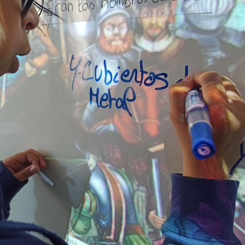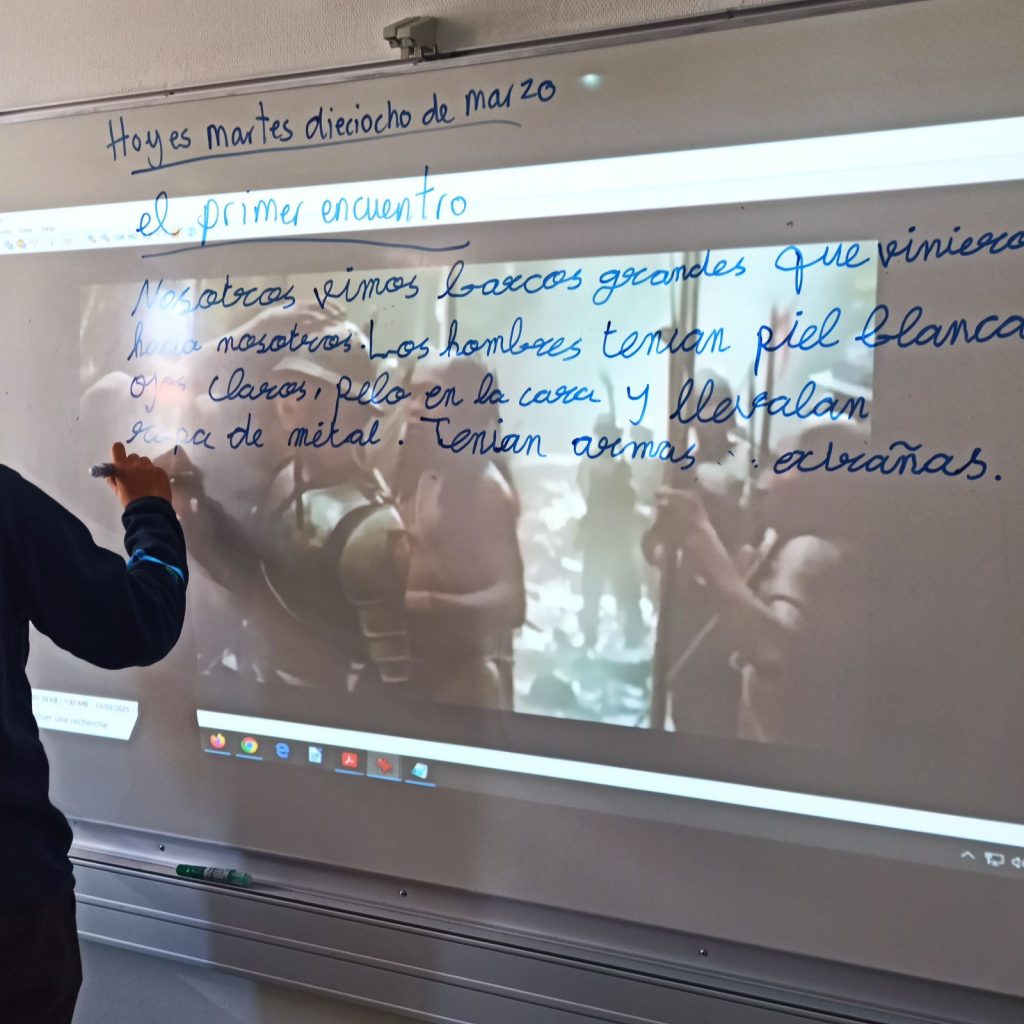 - El « encuentro »: Un extracto de la película 1492: La conquista del paraíso y el diario de Colón, que narra ese primer contacto. La película sirvió para captar su atención sobre el tema, movilizar sus conocimientos y fomentar la expresión oral. A través del diario de Colón, los alumnos comprendieron el impacto emocional, cultural e histórico de ese momento, lo que les permitió después narrar el encuentro desde el punto de vista de los indígenas.
