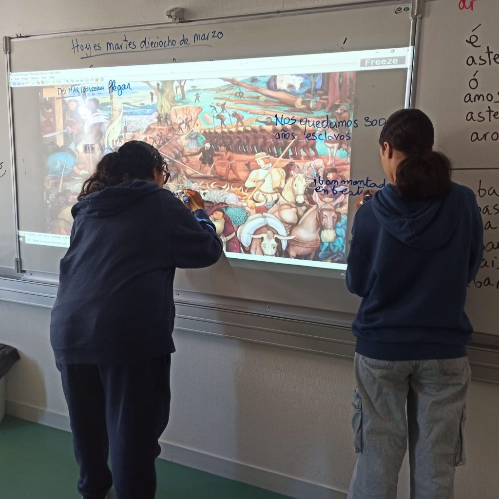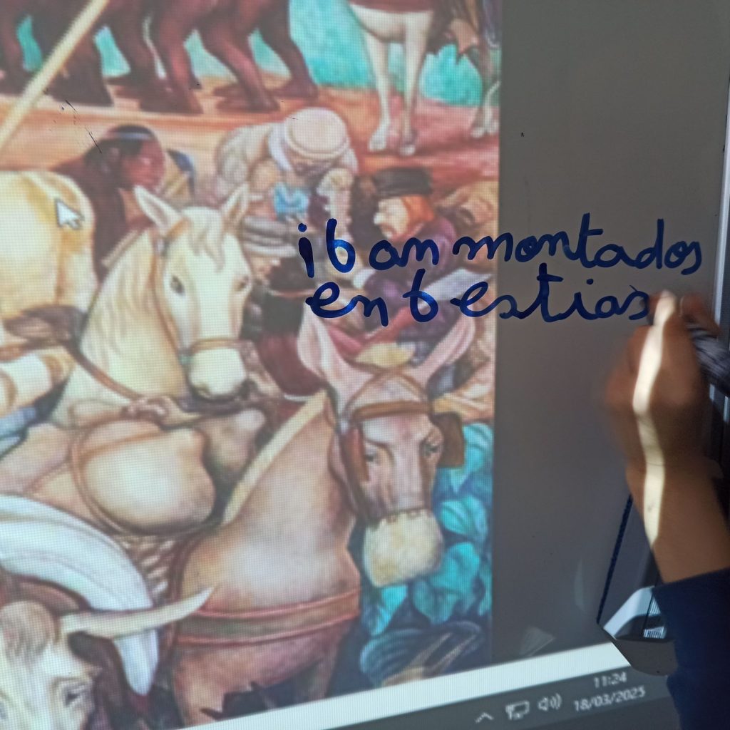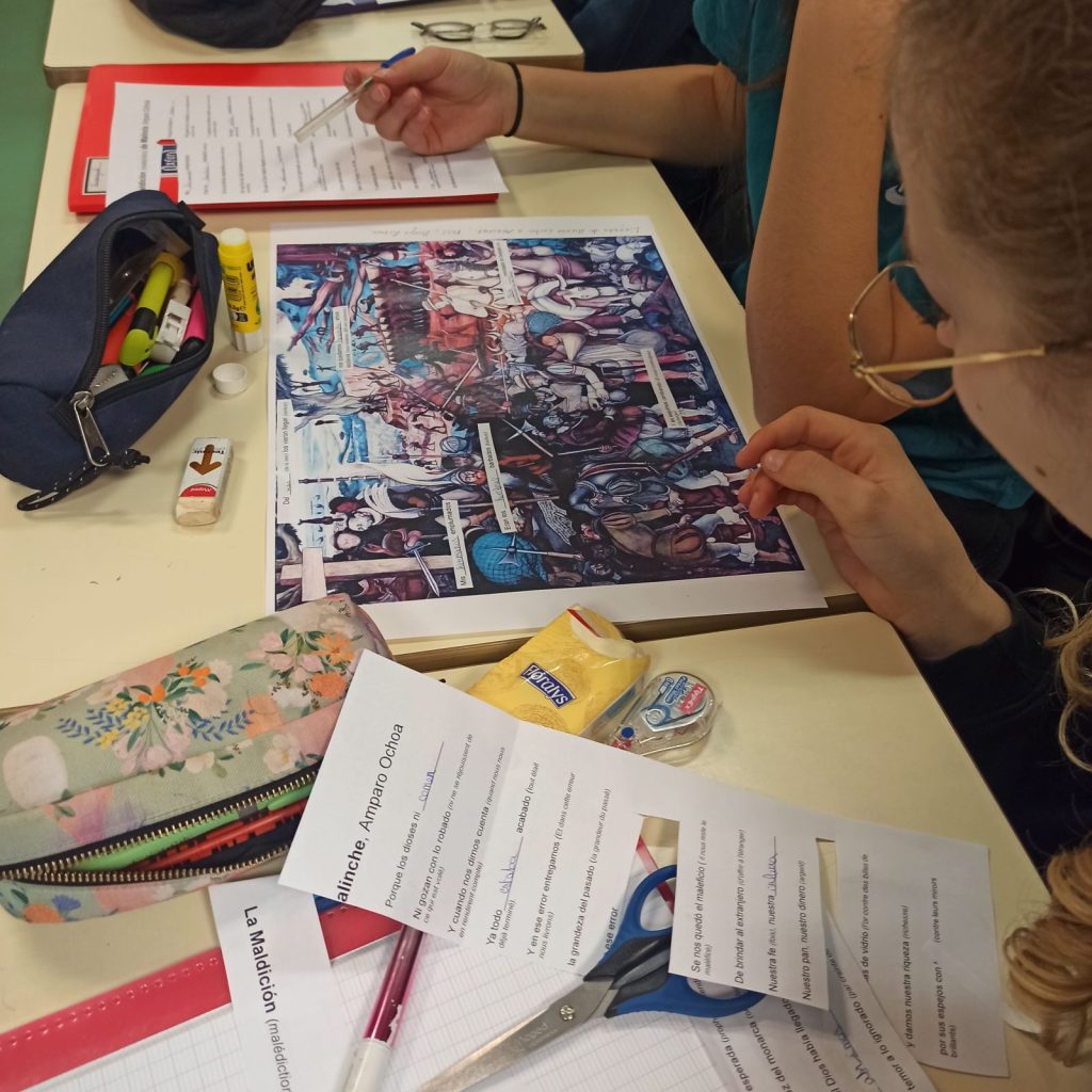 - El « desencuentro »: Tras presentar brevemente la figura de La Malinche mediante varios documentos iconográficos y un vídeo sobre la bande dessinée Celle qui parle, de la autora española Alicia Jaraba, trabajamos dos documentos de manera conjunta: la letra de la canción La maldición de Malinche, de Amparo Ochoa, y el mural de Diego Rivera. No conocía la canción y me sorprendió lo bien que ambas obras coincidían, como anillo al dedo.