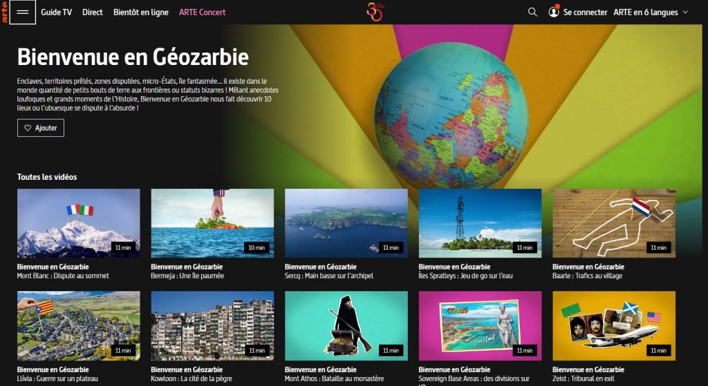 Référencée par le site Géoconfluences dans le cadre d’un article récent, la série Bienvenue en Géozarbie (disponible sur Arte) se propose d’explorer, dans le cadre d’épisodes de 10-11 minutes, quelques bizarreries géographiques entre « anecdotes loufoques et grands moments de l’Histoire ». Certaines sur les îles Spratleys, le Mont Blanc constituent de bonnes entrées pour le traitement des questions d’HGGSP ou de Terminales.