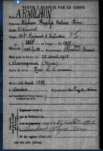 Ce soldat a été choisi par l’enseignante car il était un ami de l’écrivain Henri Pourrat, dont le collège porte le nom. Henri Pourrat gardant des séquelles de la tuberculose n’a pas été mobilisé en 1914. Au printemps 1916, il retrouve à Ambert Pierre Armilhon, blessé au front et de retour dans sa famille pour une convalescence de plusieurs mois. Ce sont les discussions avec ce dernier qui donnent à Henri Pourrat l’idée du cycle des Montagnards, chronique paysanne de la Grande Guerre publiée en 1919. C’est notamment grâce aux écrits d’Henri Pourrat que nous connaissons le parcours de Pierre Armilhon et de ses frères durant la guerre.