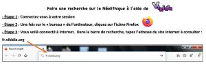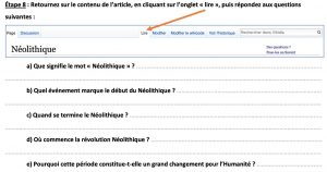 – 1ère heure : L’activité est réalisée en binômes, en salle informatique, à l’aide de la fiche-élèves « Faire une recherche sur le Néolithique à l’aide de Vikidia ».