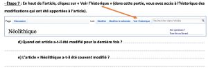 – Les élèves naviguent au sein de l’article « Néolithique » et analysent l’historique de cet article : le nombre de modifications, le statut des personnes qui l’ont modifié etc. Cela permet aux élèves de confronter ce qu’ils ont compris du fonctionnement de l’encyclopédie participative à un exemple concret.
