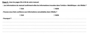 Dans l’étape 8, qui correspond à la recherche d’informations sur le Néolithique, il est tout à fait envisageable de rajouter d’autres questions pour « complexifier » la tâche de certains élèves. Ex : citez le nom de plusieurs villages du Néolithique.