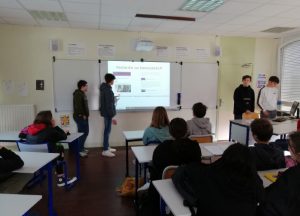 Lors de la présentation en classe, ce paragraphe était soutenu par un diaporama. Cette présentation a eu lieu au début d’une heure de cours et a duré 20 min. Elle a permis aux élèves de travailler plusieurs compétences comme la méthodologie de la recherche sur internet (s’informer dans le monde du numérique), la méthodologie du développement construit et la pratique de l’oral (pratiquer différents langages).