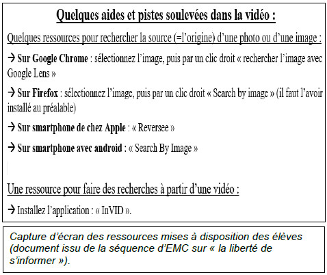 Renouveler cette expérience sur des photographies ou des vidéos, dans le cadre d’un travail en lien avec les programmes, ou ponctuellement comme lors de la semaine de la presse, semble indispensable pour consolider l’utilisation des outils numériques et la construction des ressources de références pour s’informer dans le monde numérique. Il peut permettre à cette occasion la sollicitation de plusieurs disciplines, particulièrement le professeur documentaliste.