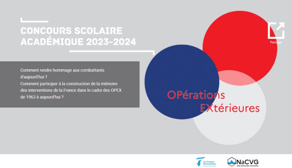 Le Trinôme académique et la DAAC de l’académie de Clermont-Ferrand en partenariat avec l’ONACVG du Puy-de-Dôme et la France Mutualiste propose un concours scolaire académique intitulé « Comment rendre hommage aux combattants d’aujourd’hui ? Participer à la construction de la mémoire des interventions de la France dans le cadre des OPEX de 1963 à aujourd’hui ».