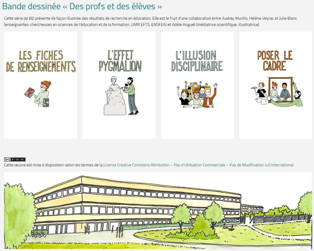 « Des profs et des élèves », ce sont 4 bandes dessinées -fruits d’une collaboration au sein de l’École Nationale Supérieure de Formation de l’Enseignement Agricole de Toulouse-Auzeville– visant à mieux faire comprendre et gérer les élèves au quotidien, en posant un cadre sain pour les apprentissages. Chaque BD est téléchargeable au format .PDF à l’adresse suivante https://comprendreleseleves.ensfea.fr/bande-dessinee/