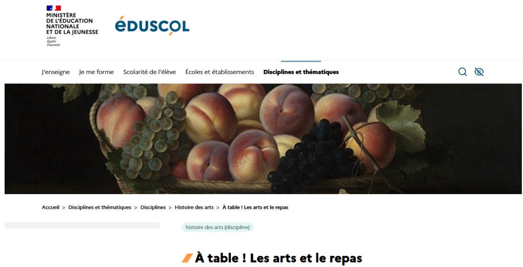 À table ! Les arts et le repas est une page Éduscol Histoire des Arts proposant pistes et autres ressources vous permettant d’aborder la thématique du repas et du goût. Elle offre l’opportunité de décloisonner les arts, de les mettre en lien avec les sciences, l’histoire et la société, dans des points de programme au collège et au lycée.