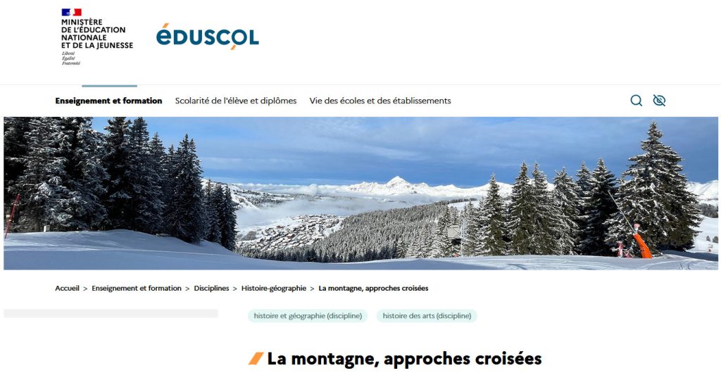 La montagne, objet d’étude de la géographie, constitue également un sujet privilégié pour de nombreux artistes. Au collège et au lycée, elle peut faire l’objet d’approches croisées, à l’appui des programmes, entre géographie, histoire et histoire des arts. C’est la réflexion que la page thématique Éduscol Histoire-Géographie vous invite à mener entre travail sur les représentations de la montagne, ressources et pistes pédagogiques disciplinaire.