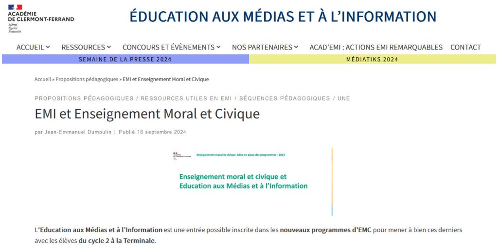 Dans le cadre de la mise en oeuvre des nouveaux programmes d’Enseignement Moral et Civique (EMC), ils vous proposent un recensement de toutes les ressources pédagogiques du CLEMI (séances/ séquences d’EMI Éducation aux Médias et à l’Information clés en main) qui vous permettront de mettre en œuvre des activités EMI avec vos élèves. Rendez-vous à l’adresse suivante pour les consulter : https://pedagogie.ac-clermont.fr/emi/2024/09/18/emi-et-enseignement-moral-et-civique/