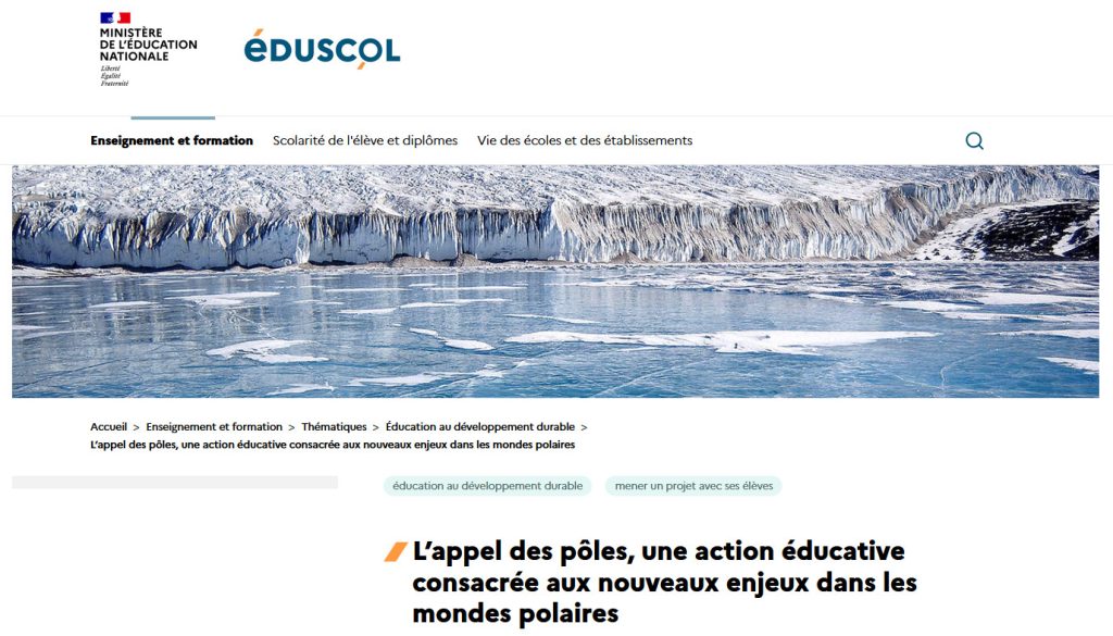 ■ Le projet L »Appel des pôles, une action éducative qui a vocation à couvrir l’ensemble des enjeux liés aux zones polaires : environnementaux et climatiques, socio-économiques, géopolitiques, culturels (clôture des inscriptions mi-octobre)… : https://eduscol.education.fr/3179/l-appel-des-poles-une-action-educative-consacree-aux-nouveaux-enjeux-dans-le-monde-polaire