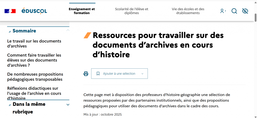 Cette page EDUSCOL met à disposition des professeurs d’histoire-géographie une sélection de ressources proposées par des partenaires institutionnels, ainsi que des propositions pédagogiques pour utiliser des documents d’archives dans le cadre des cours.