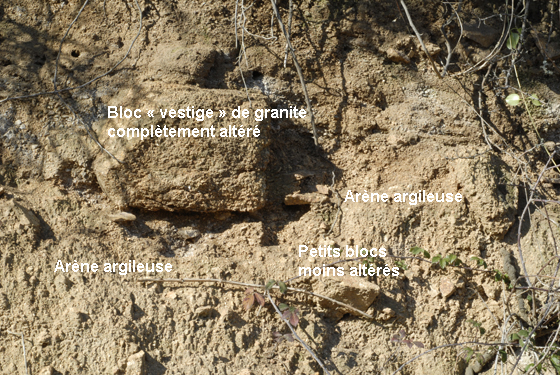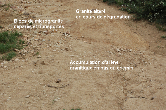 - Erosion et accumulation d’arène granitique à la base du chemin raviné – légendes