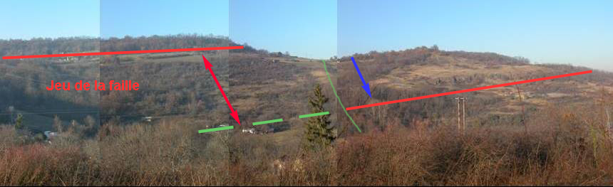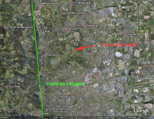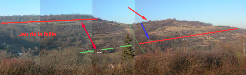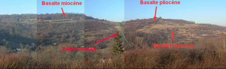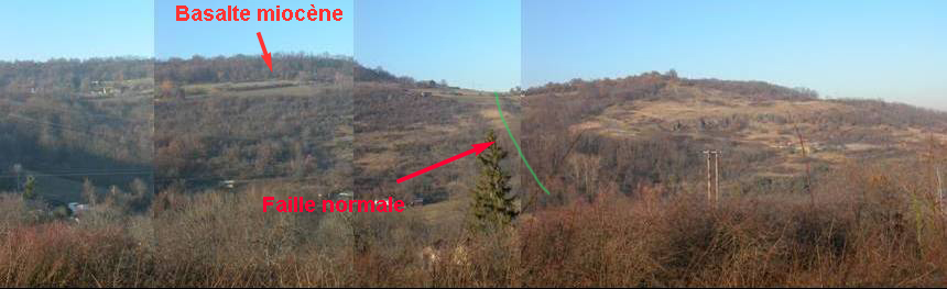 - Le trait rouge représente la base du basalte Miocène des Côtes de Clermont, niveau repère de même âge de chaque côté de la faille