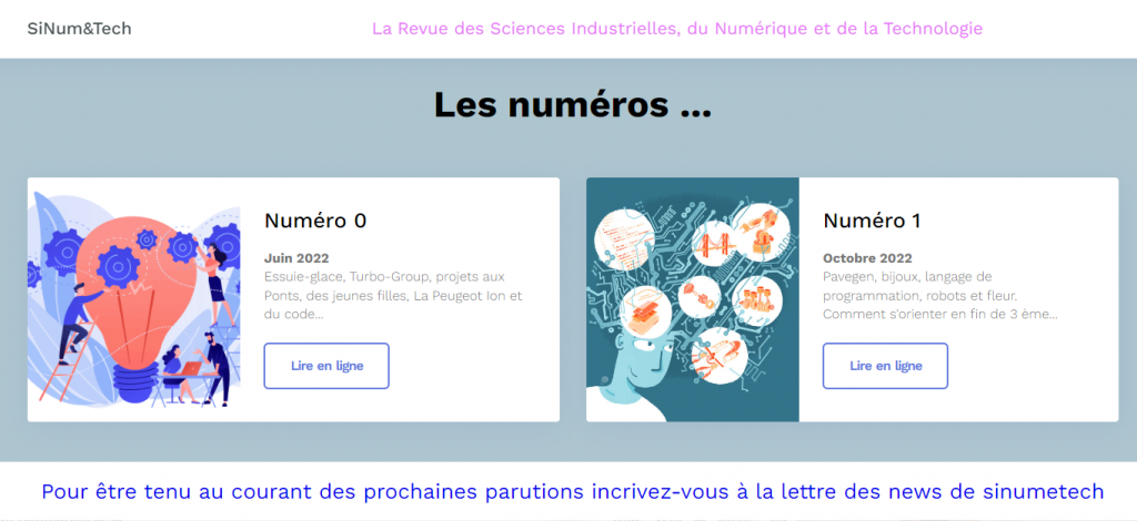 Cette revue en ligne, gratuite, indépendante, est éditée par l’association d’intérêt général Antec, soutenue par l’inspection générale de STI. Elle a pour objectifs de montrer aux élèves des collèges et des lycées que la Technologie et les Sciences Industrielles sont des disciplines scientifiques connectées au monde d’aujourd’hui et soucieuses donc du devenir de l’humanité.