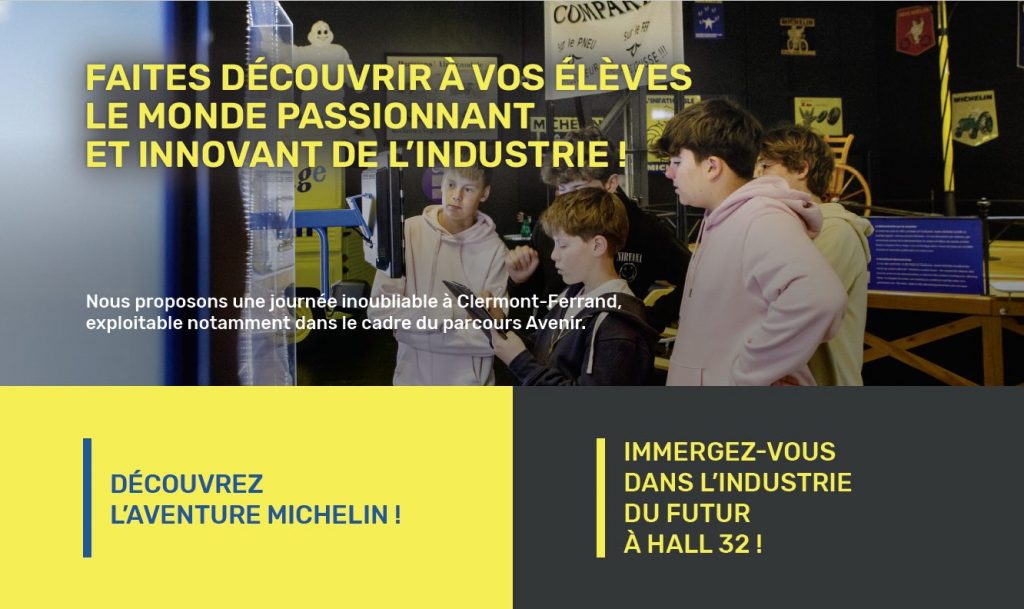 Hall 32 et l’Aventure Michelin s’associent pour proposer à vos élèves la découverte du monde passionnant et innovant de l’industrie de demain. Dans le cadre du Plan Avenir, ces deux structures ont imaginé une journée s’adressant aux élèves du cycle 4. Entièrement construite avec l’aide d’un professeur référent désigné par l’Académie, différentes activités vous sont proposées :