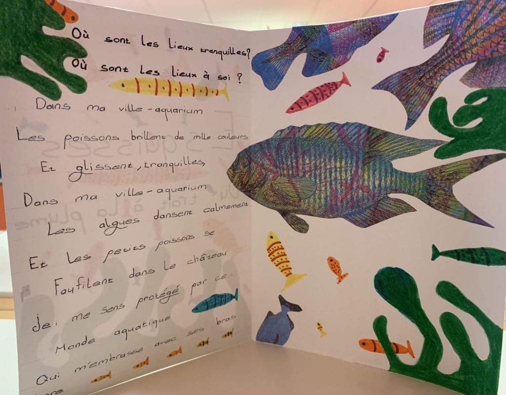 Ils ont imaginé leur cocon, leur lieu d’évasion, leur refuge : ville-champignon, ville-aquarium, nature en fête, amour à profusion…chacun a pu laisser libre cours à son imagination. Du trait à la plume, chaque création a ensuite fait l’objet d’un poème, où les mots se sont unis à l’image.