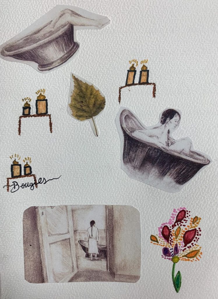 Après l’espace de la ville, les élèves se sont aventurés dans l’espace de l’intime : ils ont rédigé quelques vers à partir des illustrations de Sara Gréselle, extraits du livre Les souvenirs et les regrets aussi, représentant une jeune femme dans sa salle de bain, lieu de recueillement et de tranquillité.