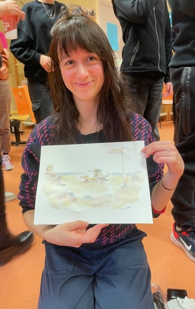 A la fin de ce rendez-vous poétique, Sara Gréselle nous a fait l’honneur et le plaisir de nous offrir, en direct, un dessin inédit inspiré de son dernier album jeunesse Ismolène et Chipolata. Munie de sa boîte d’aquarelles et de son feutre, elle a ébahi le public de collégiens, recueillis et attentifs devant l’œuvre en train de naître.