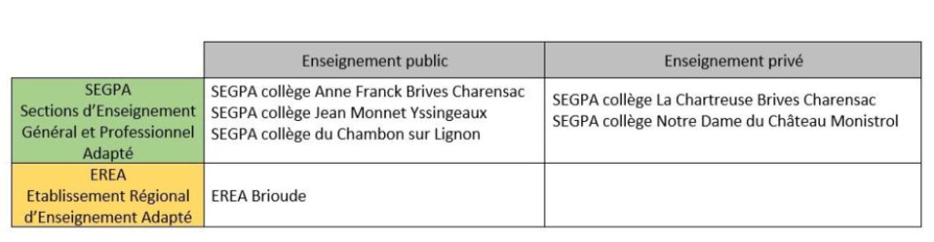 – L’une intégrée dans un collège: la section d’enseignement général et professionnel adapté (Segpa) ;