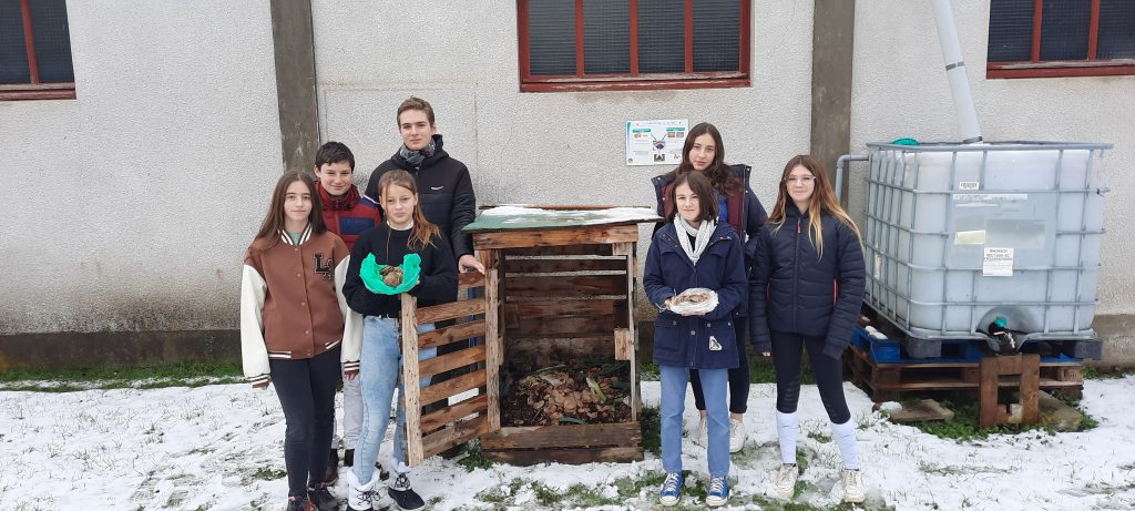 Durant l’hiver, le collège a construit un composteur réalisé à partir de planches de palettes de récupération, afin de valoriser les épluchures de la cantine et les dosettes de café de l’établissement. Le compost obtenu sera utilisé comme fertilisant pour le jardin. Enfin l’agent technique à installé un récupérateur d’eau de la toiture pour arroser le jardin.