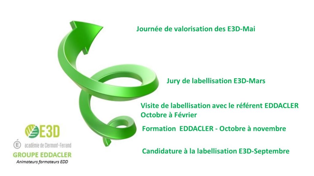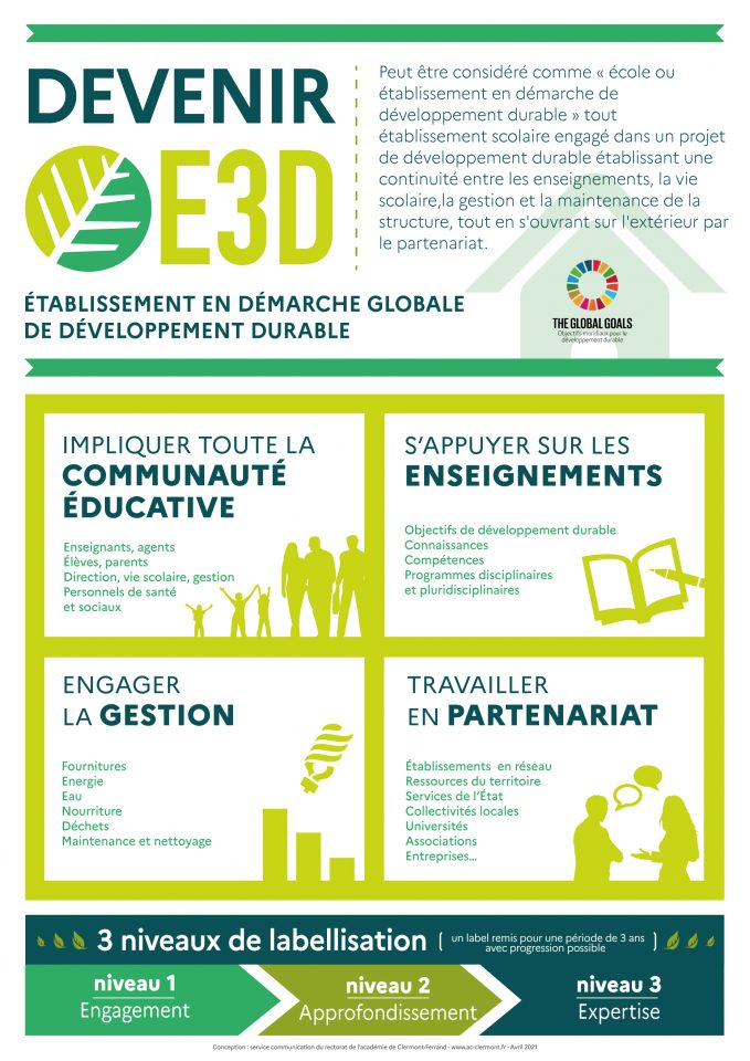 La labellisation « E3D » (École ou Établissement en Démarche globale de Développement Durable) a été développée par le ministère chargé de l’éducation nationale pour reconnaître et encourager les écoles et établissements scolaires qui s’engagent dans une démarche globale de développement durable.