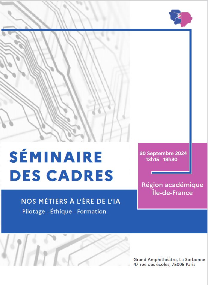 Retour sur la rencontre organisée le 30/09/24 par la DRANE Ile-de-France sur le thème : “Nos métiers à l’ère de l’intelligence artificielle” pour poser le socle d’une culture partagée sur les nouveaux gestes professionnels rendus possibles grâce à l’intelligence artificielle (ressources et captation vidéo).