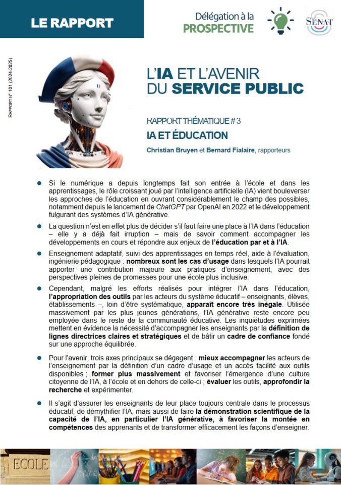 Présentation, synthèse et extraits du rapport du Sénat : AI and education, supporting current developments (30/10/24).