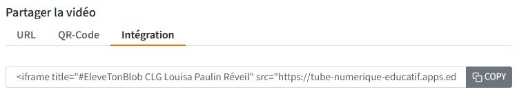 Sur Tubes dans les apps.education, récupérer le lien de partage de la vidéo en activant Partager.